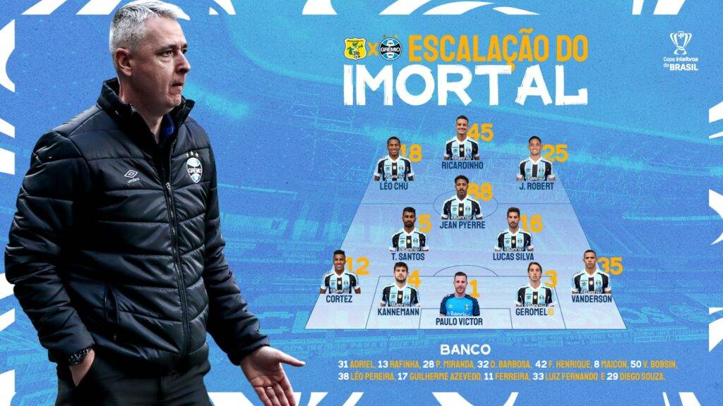 Esse jogo marcava o retorno de Tiago Nunes ao comando da equipe, mandando este plantel a campo: Paulo Victor; Kannemann e Geromel; Cortez e Vanderson; Lucas Silva, Thiago Santos e Jean Pyerre; Léo Chú, Jonatha Robert e Ricardinho.