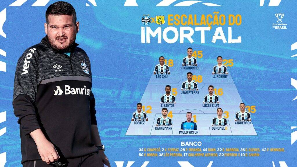 Ainda sem Tiago Nunes, nosso treinador interino mandou o seguinte time: Paulo Victor; Geromel e Kannemann; Vanderson e Cortez; Lucas Silva, Tiago Nunes e Jean Pyerre; Léo Chú, Jhonata Robert e Ricardinho.