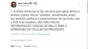 Vejam, senhoras e senhores, que nessa hipótese, tipificado o crime, o ministro da mais alta corte do Brasil pode estar em flagrante delito, e poderia até ser preso – houvesse coragem suficiente das autoridade policiais para cumprir esse dever (caso contrário, pode inclusive haver prevaricação). O detalhe foi percebido pelo Presidente da República, que postou no Twitter.