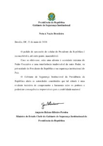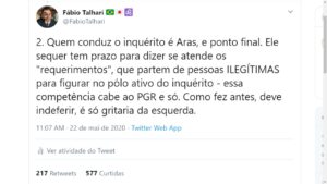 No dia, 22 de maio último, o ministro Celso de Mello encaminhou à PGR um “requerimento”, consubstanciado em três “notitia criminis“, que havia sido feito por Gleisi Hoffmann e por Rui Costa (governador da Bahia), ambos do PT, secundados pelas bancadas parlamentares do PV, PDT e PSB. Os “requerimentos” em tela incluíam pedido de depoimento do Presidente da República, no inquérito, busca e apreensão dos celulares do Presidente e de Carlos Bolsonaro, bem como a intimação e oitiva do General Augusto Heleno, da deputada Carla Zambelli e de Sérgio Moro.