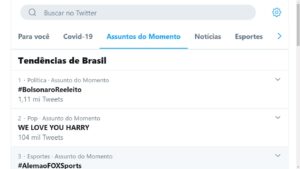 Tanto que no dia 23 de maio, sábado, subiu meteoricamente uma tag, #BolsonaroReeleito, que chegou a 1,8 milhão de postagens, antes que o Twitter a derrubasse. No momento em que a printei, estava assim: