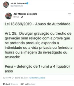 Diante disso, para estarrecimento geral da nação, Celso de Mello determinou a divulgação do vídeo da reunião ministerial, praticamente na íntegra, excluídos alguns trechos que tratavam de relações internacionais (suponho que Celso o tenha feito para preservar a China, curiosamente, sem poupar o Brasil, entretanto). Nesse ponto, aconteceu o maior dos absurdos. Sem adentrar ao conteúdo do vídeo, a simples divulgação dele em sua quase totalidade representa um claríssimo abuso de autoridade, conforme o artigo 28 da Lei 13.869/19, que estabelece:
