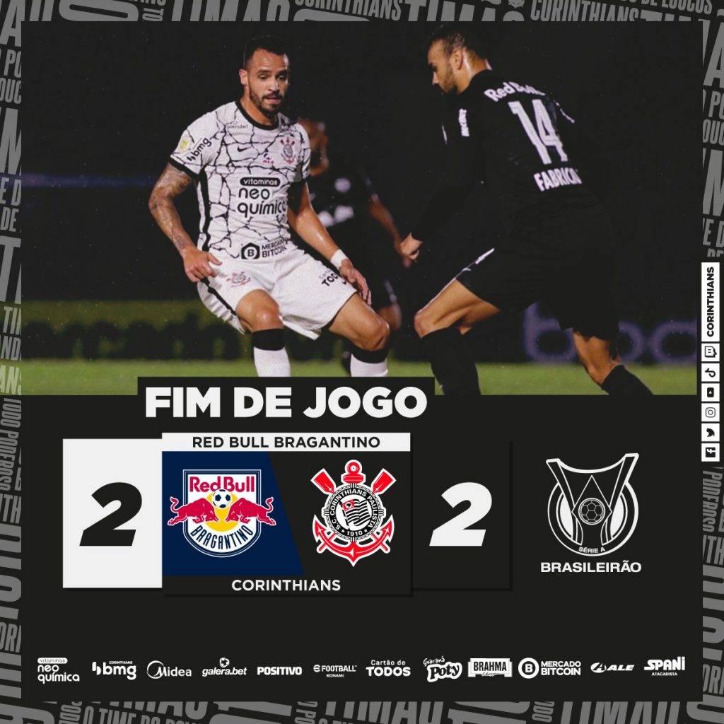 O árbitro deu 8 minutos de acréscimos devido ao tempo perdido na checagem do segundo gol do RBB. Como dizem: enquanto tem bambu, tem flecha! E o Corinthians foi certeiro! Aos 50, após jogada de Adson a bola sobrou para Mosquito. O camisa 19 bateu forte de dentro da área e estufou as redes do adversário novamente!