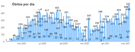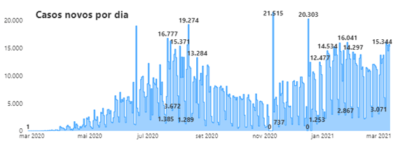 Perceba que houve uma alta entre março (começo da pandemia) e junho, no entanto, houve uma baixa de 5 meses, a contar de agosto, quando o estado ensaiou uma reabertura parcial. Veja que essa reabertura parcial não mudou muito a realidade, visto que entre junho e agosto os casos continuaram oscilando. No entanto, a partir de agosto, na fase amarela, com muitos serviços liberados, os óbitos começaram a cair, tendo esse cenário vigorado até janeiro de 2021 aproximadamente, quando começaram a aparecer as novas cepas do vírus e começou todo aquele ciclo novamente.