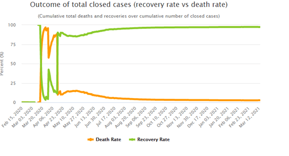 A linha verde é a taxa de recuperação e a laranja, a de morte. Veja que a linha verde tem crescido desde abril, quando a pandemia começou a se tornar significativa no Brasil, ao passo que a linha laranja tem caído, apesar de que cada vez mais pessoas tiveram contato com a doença. Esses dados também reforçam a tese de que o lockdown não funciona, pois, se funcionasse, a partir do momento que houvesse relaxamento das medidas impostas de forma arbitrária pelos governadores e prefeitos, a linha laranja não iria mais cair, mas sim aumentar.