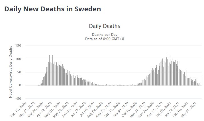 O gráfico se parece com o da Bélgica: houve uma explosão de mortes de março até maio, tendo os óbitos dimiuído a partir de junho e voltando a subir em dezembro. Mas qual é a diferença entre esses dois países? Ambos têm aproximadamente a mesma população  (11,46 milhões para a Bélgica e 10,23 para a Suécia), ambos são considerados países de primeiro mundo e são monarquias parlamentares. A diferença é que a Suécia não fez lockdown e nem obrigou os cidadãos a usarem máscaras, a vida seguiu normal ali, diferente da Bélgica. Com isso, o país escandinavo tem apenas 13.146 mortes por coronavírus e figura na posição 25º do ranking de mortes por milhão de habitantes, ao passo que a Bélgica, que seguiu a cartilha do lockdown, tem 22.421 (isto é, quase o dobro) de mortes por coronavírus e figura na 4º posição do ranking internacional de mortes por  milhão de habitantes. Um desses países fez lockdown, destruiu sua economia e teve mais mortos, o outro não fez lockdown, teve efeitos bem menos devastadores na economia e teve muito menos mortos, o que no mínimo corrobora a tese de que o lockdown não impede o vírus de se disseminar e consequentemente de matar as pessoas, algo que foi reconhecido inclusive pela OMS.