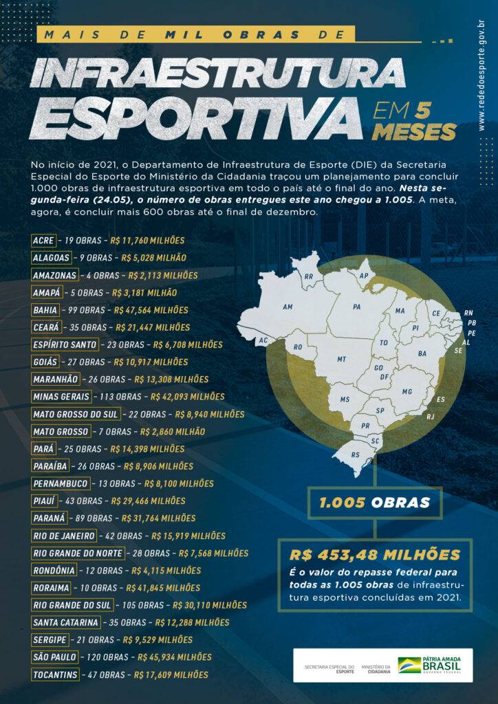 “Termos concluído essas 1.005 obras antes do fim de maio é motivo de orgulho. São quadras poliesportivas, campos e estádios de futebol, complexos esportivos, ginásios, piscinas, pistas de skate e academias ao ar livre prontas para serem utilizadas pelas comunidades de 26 estados”, ressaltou Marcelo Magalhães.