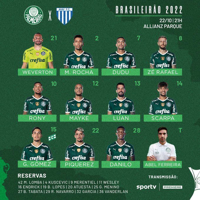-Último jogo: 26/06/2022 – Avaí 2×2 Palmeiras (gols Gustavo Scarpa e Rony) – Ressacada (Florianópolis-SC) – Campeonato Brasileiro
