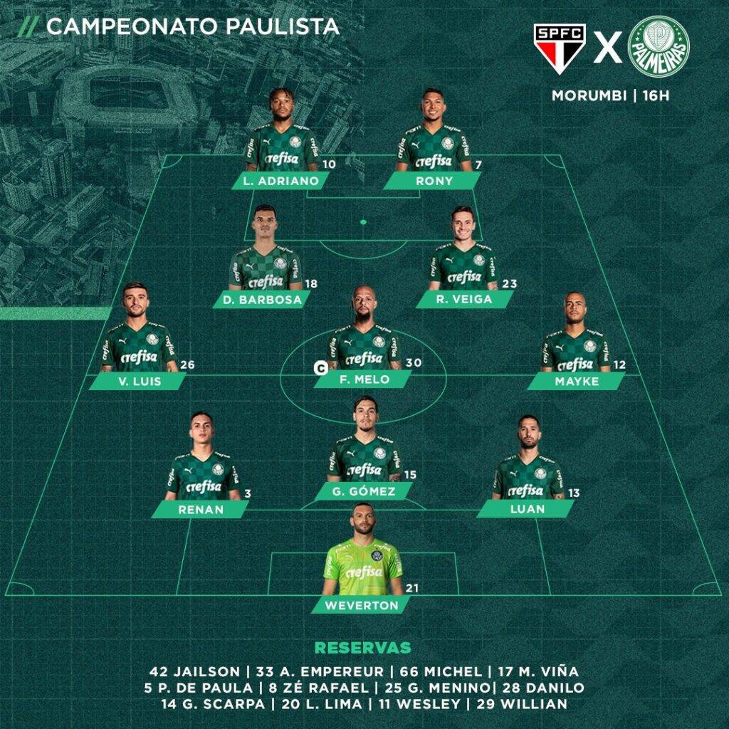 Para o confronto final do Paulistão, o professor Abel montou um time no já tradicional esquema tático 3-5-2, com o nosso querido paredão Weverton, fechando o nosso gol; Renan, Gustavo Gómez e Luan, na zaga; Victor Luís, na lateral esquerda e Mayke, na lateral direita; Danilo Barbosa, Felipe Melo e Raphael Veiga, no meio campo; e a super dupla Luiz Adriano e Rony, no ataque! É praticamente o mesmo time que jogou a primeira partida da final, apenas com Danilo Barbosa entrando no lugar de Patrick de Paula, que nesta partida iniciou como reserva. É um excelente time, e nossas opções no banco de reservas também eram excelentes, com a novidade da escalação de Alan Empereur, recuperado de uma lesão!