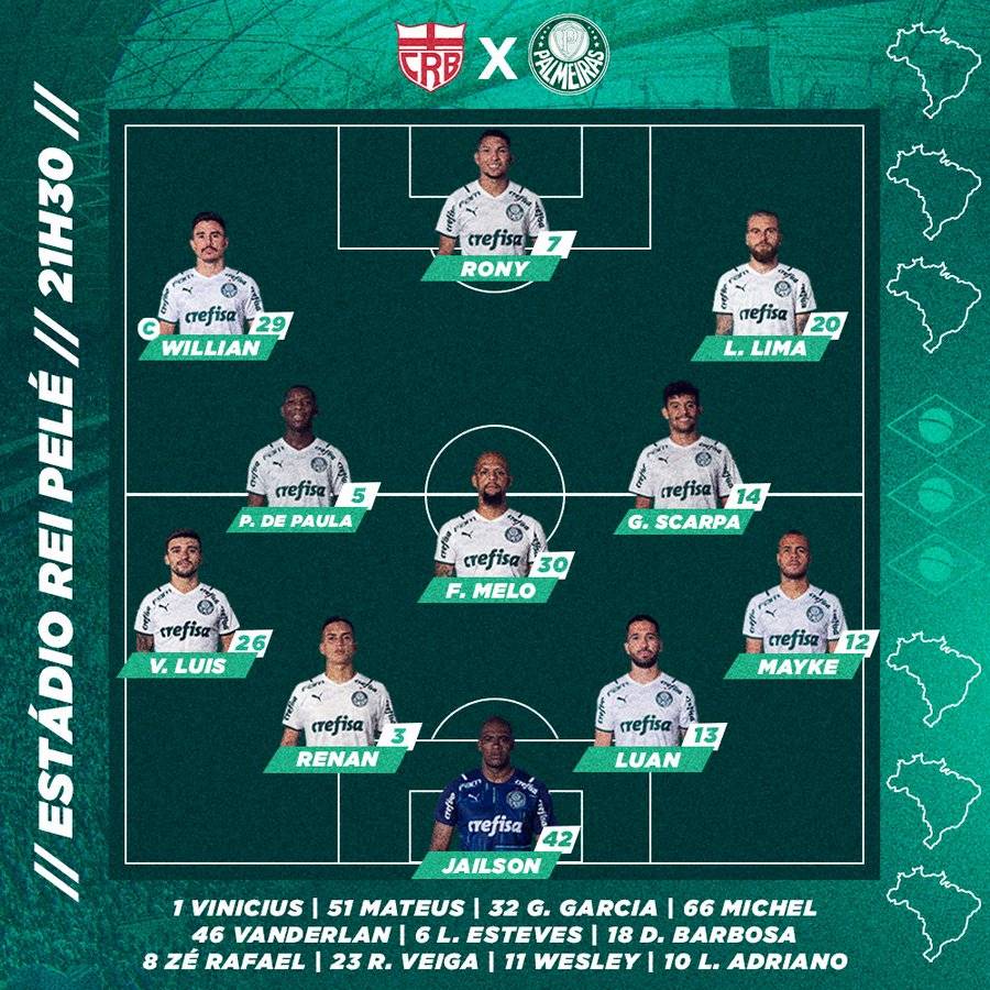 Para esta partida, o Professor Abel Ferreira montou nossa equipe no esquema tático 4-3-3, com Jailson, fechando o nosso gol; Renan e Luan, na zaga; Victor Luís, pela esquerda e Mayke pela direita; Patrick de Paula, Danilo e Gustavo Scarpa, no meio campo; e Willian, Rony e Lucas Lima, no ataque.