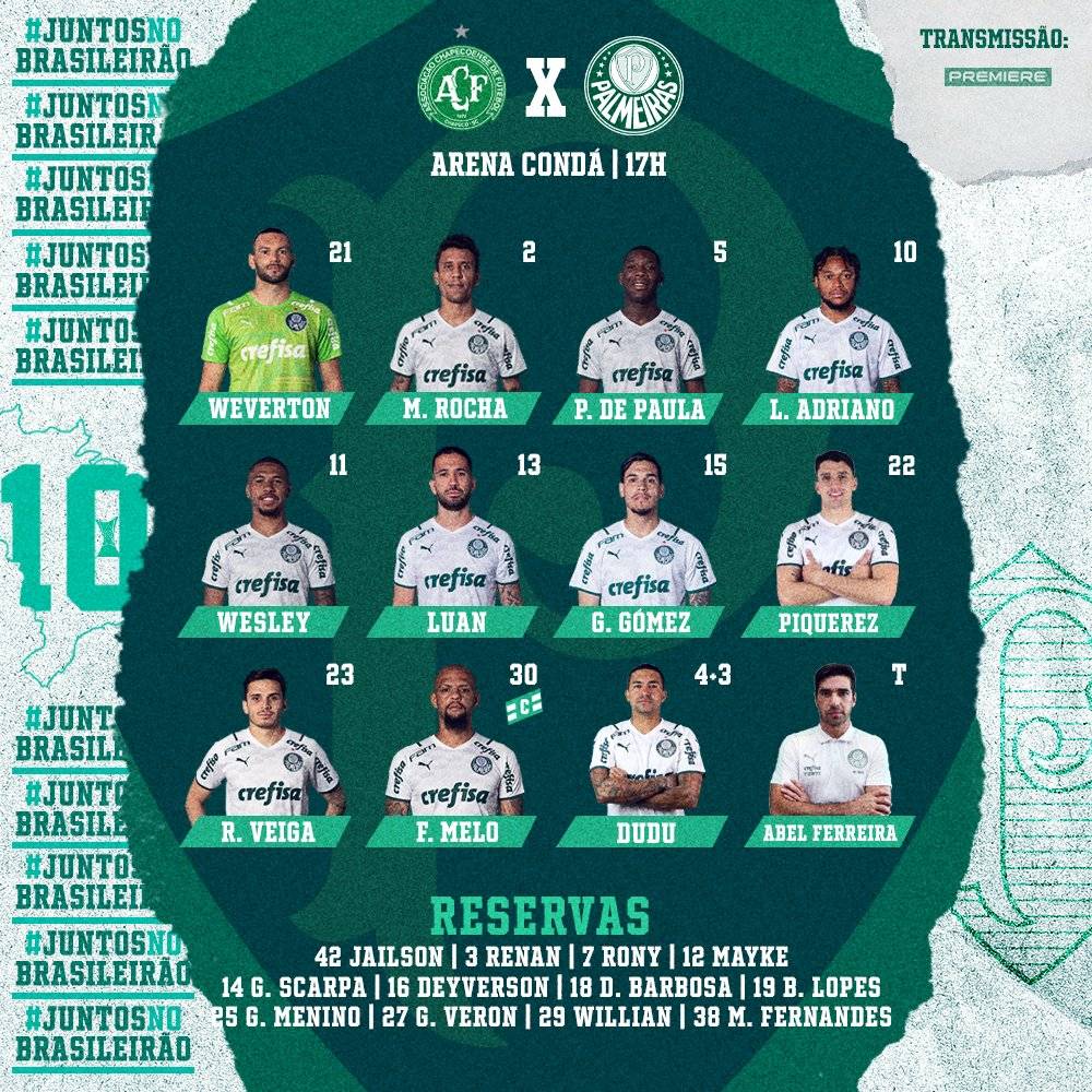 Para esta partida, o Professor Abel Ferreira montou um time com o aparente esquema tático 4-4-2, com o Weverton fechando o nosso gol; Gustavo Gómez e Luan, na zaga; Piquerez, na lateral esquerda e Marcos Rocha, na lateral direita; Dudu, Patrick de Paula, Felipe Melo e Raphael Veiga, no meio campo; e Wesley e Luiz Adriano, no ataque. Um bom time, capaz de enfrentar sem maiores preocupações a equipe da Chapecoense que, sem querer menosprezar, não vai bem no campeonato, tendo apenas a vitória sobre o Red Bull Bragantino como algo surpreendente para apresentar.