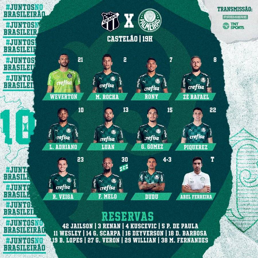 O maior campeão do Brasil volta a campo hoje (20), para enfrentar o time do Ceará, na Arena Castelão, em Fortaleza, em partida válida pela 19ª rodada do Campeonato Brasileiro. Esta partida deveria ter ocorrido em 5 de setembro, porém foi cancelada pela CBF pelo fato do Palmeiras ter jogadores convocados para atuar pela Seleção Brasileira nas Eliminatórias da Copa do Mundo do Catar.