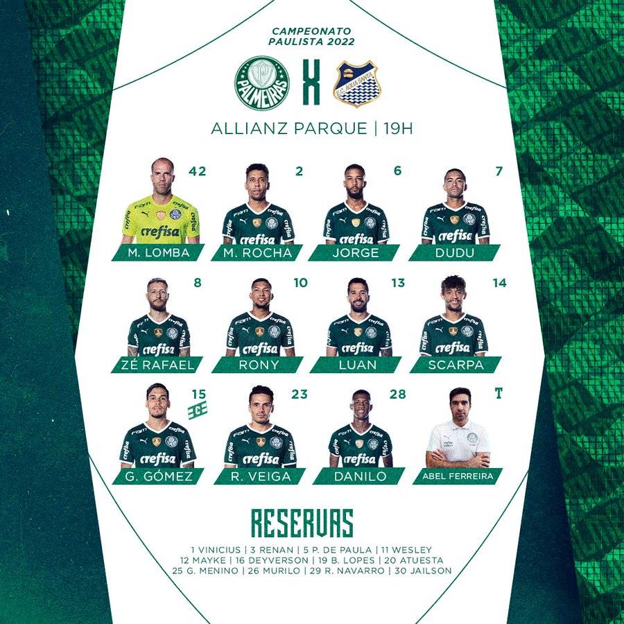 Para esta partida, o Professor Abel Ferreira ainda não poderá contar com o nosso paredão Weverton, escalado pela Seleção Brasileira, e o zagueiro Benjamin Kuscevic, escalado pela seleção chilena. O Professor montou um time com o Marcelo Lomba fechando o nosso gol; Marcos Rocha, na lateral direita e Jorge, na lateral esquerda. Gustavo Gómez e Luan, na zaga; Gustavo Scarpa, Zé Rafael e Danilo no meio campo; Dudu, Raphael Veiga e Rony na linha de ataque. Aparentemente o esquema tático será um 4-3-3, mas sabemos que ao longo da partida o esquema pode mudar para se adaptar às necessidades do momento. Jorge entra no lugar de Piquerez, diagnosticado com Covid-19, assim como Gabriel Veron.