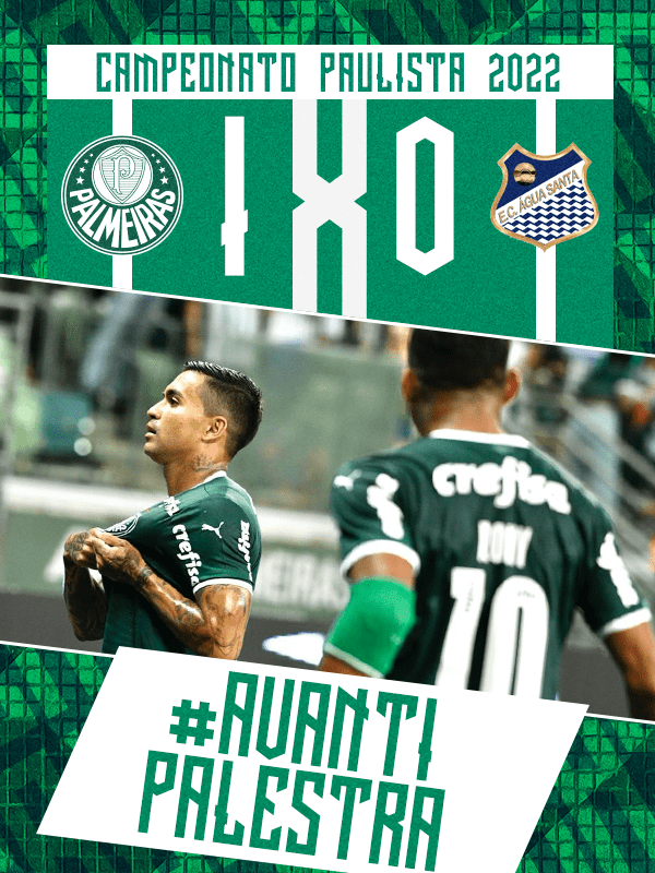 Aos 40 minutos, nossas últimas substituições, com as entradas de Breno Lopes, Deyverson, Wesley e Atuesta, em substituição a Dudu, Rony, Raphael Veiga e Zé Rafael. Sem muito mais o que comentar, o jogo chegou ao fim no Allianz Parque! Palmeiras 1×0 Água Santa.