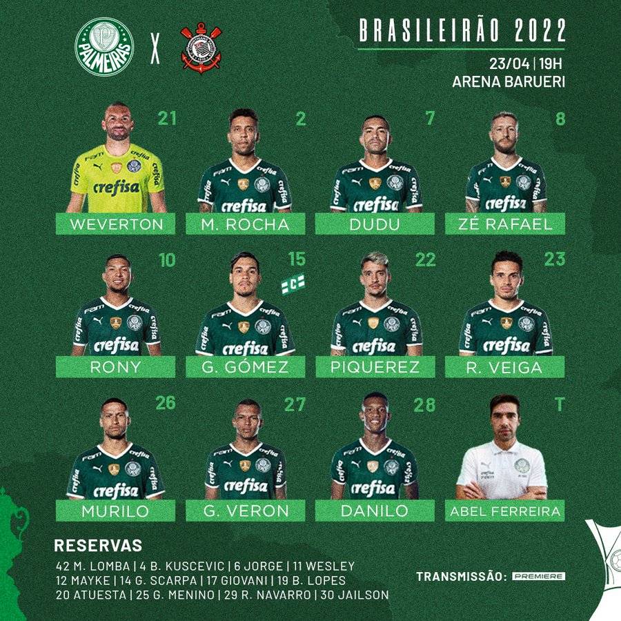 O Palmeiras irá a campo com o Weverton, fechando o nosso gol; Piquerez na lateral esquerda e Marcos Rocha na lateral direita; Murilo e Gustavo Gómez na zaga; Zé Rafael, Danilo e Raphael Veiga no meio campo; Gabriel Veron, Dudu e Rony na linha de ataque. Praticamente nosso time titular, com exceção apenas de Murilo e Veron, organizado num provável esquema tático inicial 4-3-3, e plenamente capaz de enfrentar o Corinthians sem sustos.