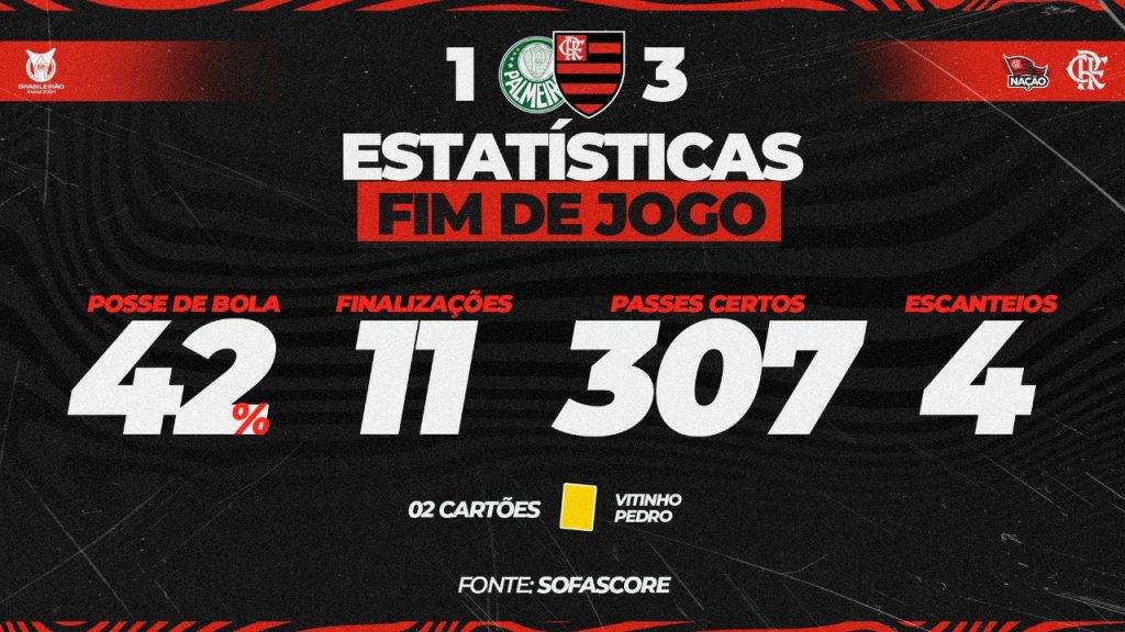 O Flamengo aumentou sua galeria de gols e chegou a 32 gols neste brasileiro em apenas 16 jogos. Na partida, o Palmeiras teve a maior porcentagem de posse de bola com 59%, e 12 chutes a gol, contra 11 chutes do mengão e 41% de posse de bola.